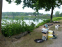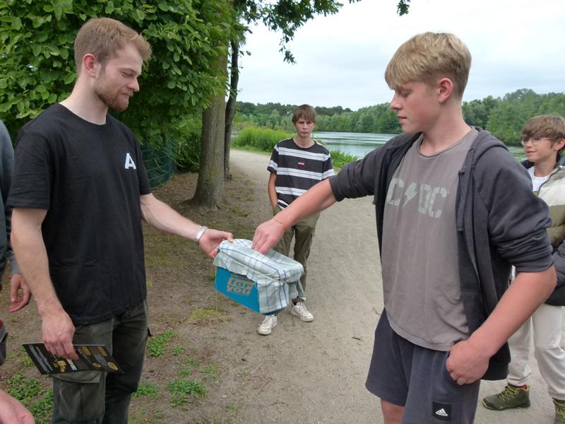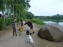 So konnten wir nur nach bestem Wissen und Gewissen die Angelplätze ausstecken. Bei unserer offiziellen Begrüßung erklärte ich den Junganglern die Situation und worauf sie achten sollten, wenn sie mehr als nur ein paar Weißfische fangen wollten. Für unser Angeln selbst gab es einige Zugeständnisse für die Jugend. So durften sie mit zwei Ruten angeln, sie durften dem Raubfisch nachstellen und es war für sie erlaubt in dieser Nacht ein Zelt zu nutzen. Was auch nötig war, denn kurz nachdem es ans Wasser ging, fing es richtig an zu schütten. Nur gut, dass der Regen nicht lange anhielt. Doch trotz des trockenen Wetters, gab es gleich zwei, die so richtig nass wurden. Einmal Roman, einer unser Betreuer, der freiwillig ins Wasser ging, um einen abgestürzten Ballon zu retten. Ich hatte ihm gesagt, dass da bestimmt 50 Euro dranhängen. Was sich als falsch herausstellte. Es war nur eine Karte auf der „Schön, dass du da bist!" stand. Und dann landete einer der jüngeren Teilnehmer völlig unfreiwillig im See. Manchmal zahlt es sich tatsächlich aus, wenn Eltern mitdenken und Wechselklamotten einpacken.