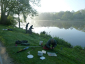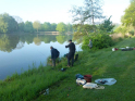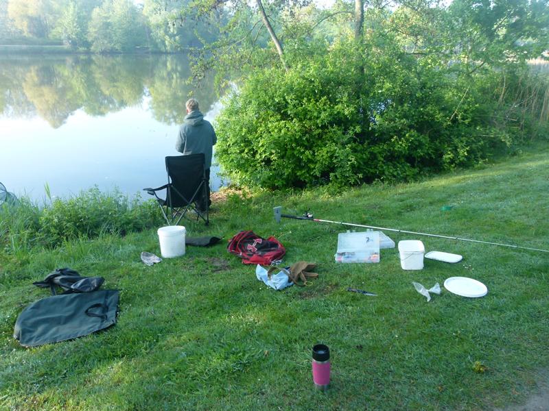 So langsam tauchten die ersten Teilnehmer auf. Mein Versuch gespendetes Angelmaterial loszuwerden, endete mit der Frage, ob man die Sachen vom letzten Mal wieder zurückgeben könnte. Tatsächlich bin ich dann aber doch noch einen Angelkoffer losgeworden. Um kurz nach acht ging es für acht Jungangler an die Angelstellen. Nachdem einige Montagen von Willi und Jens überarbeitet wurden, sollten eigentlich so langsam die ersten Fische beißen. Eigentlich schien an diesem Tag aber nicht zu funktionieren. Egal, was probiert wurde, die Posen wollten einfach nicht untergehen. Johann versuchte sogar mit einem gezupften Wurm einen Barsch zu überreden. Barsche sind bei uns in der Jugendgruppe nämlich auch in der Wertung. Für einen Moment der Spannung sorgte dann allerdings ein anderer Fisch, denn ein Hecht um die 70 cm packte sich den Wurm. Doch der Drill war schnell vorbei. Mit einem Schwall verabschiedete sich der Räuber wieder in die Tiefe. So konnte bis zum Schluss leider kein einziger Fisch gefangen werden. Für uns bleibt nur die Hoffnung, dass die Jugend wenigstens die Natur und das schöne Wetter genießen konnte. Und beim nächsten Mal beißt bestimmt was!