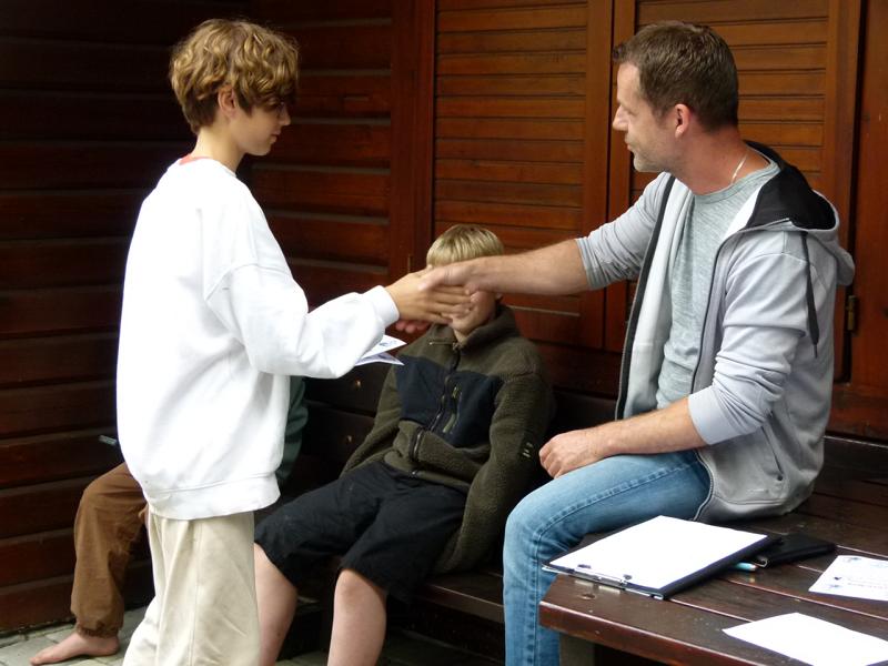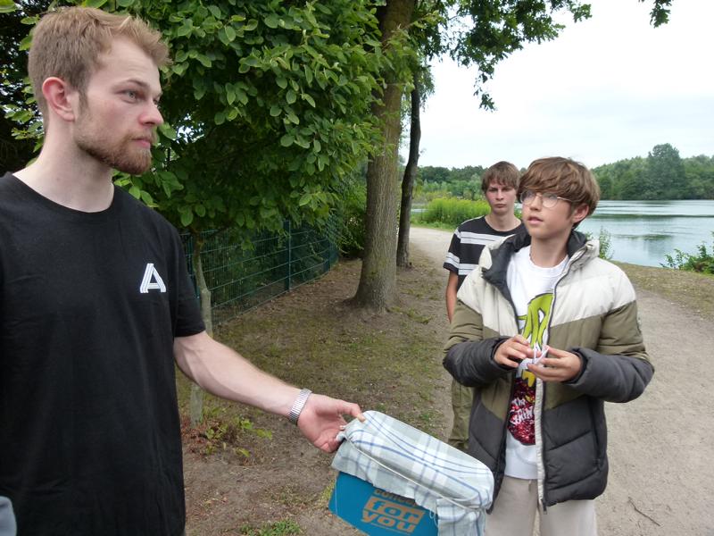 So konnten wir nur nach bestem Wissen und Gewissen die Angelplätze ausstecken. Bei unserer offiziellen Begrüßung erklärte ich den Junganglern die Situation und worauf sie achten sollten, wenn sie mehr als nur ein paar Weißfische fangen wollten. Für unser Angeln selbst gab es einige Zugeständnisse für die Jugend. So durften sie mit zwei Ruten angeln, sie durften dem Raubfisch nachstellen und es war für sie erlaubt in dieser Nacht ein Zelt zu nutzen. Was auch nötig war, denn kurz nachdem es ans Wasser ging, fing es richtig an zu schütten. Nur gut, dass der Regen nicht lange anhielt. Doch trotz des trockenen Wetters, gab es gleich zwei, die so richtig nass wurden. Einmal Roman, einer unser Betreuer, der freiwillig ins Wasser ging, um einen abgestürzten Ballon zu retten. Ich hatte ihm gesagt, dass da bestimmt 50 Euro dranhängen. Was sich als falsch herausstellte. Es war nur eine Karte auf der „Schön, dass du da bist!" stand. Und dann landete einer der jüngeren Teilnehmer völlig unfreiwillig im See. Manchmal zahlt es sich tatsächlich aus, wenn Eltern mitdenken und Wechselklamotten einpacken.