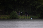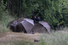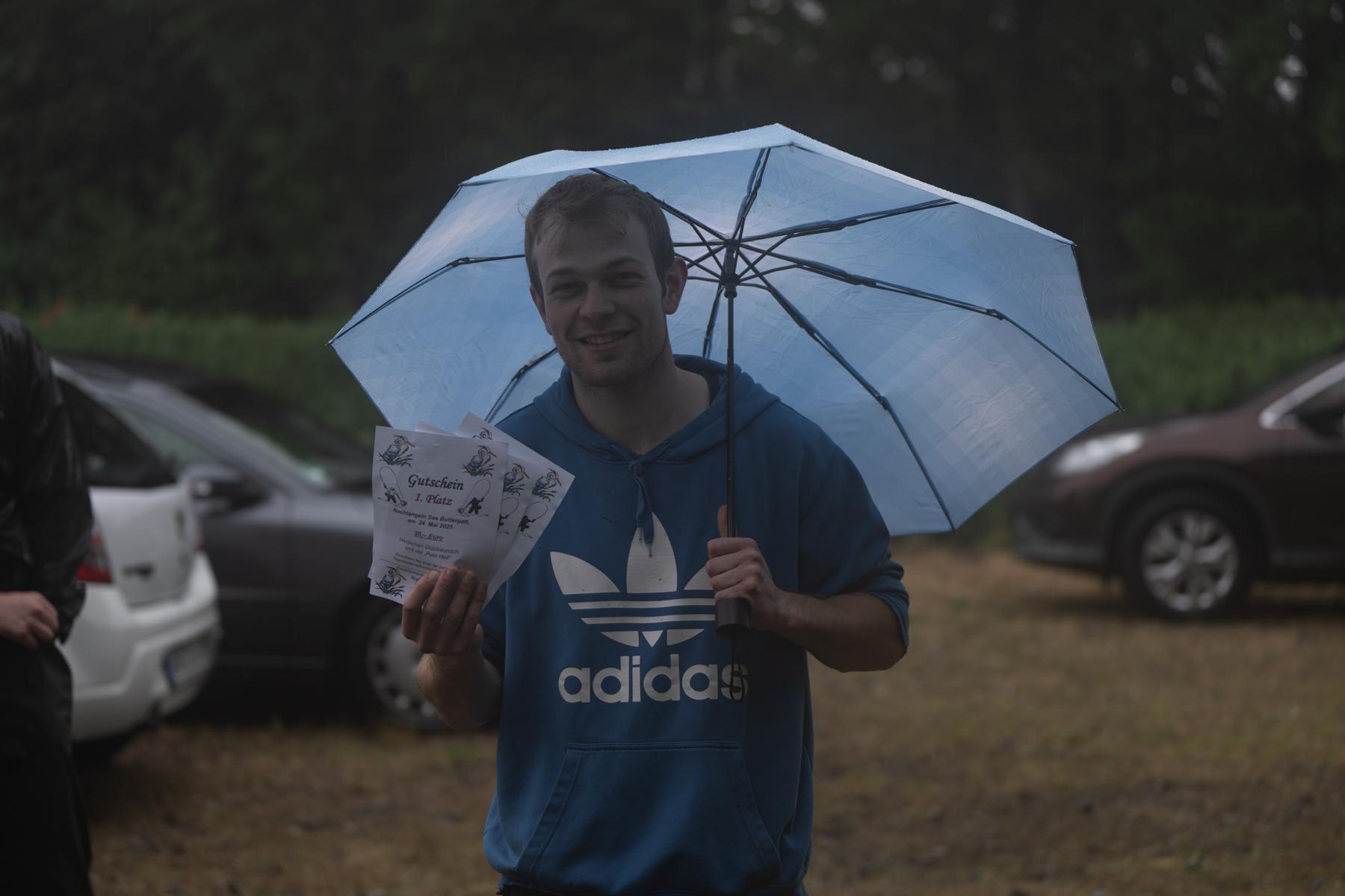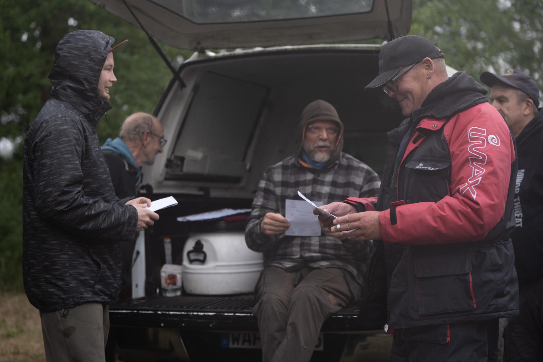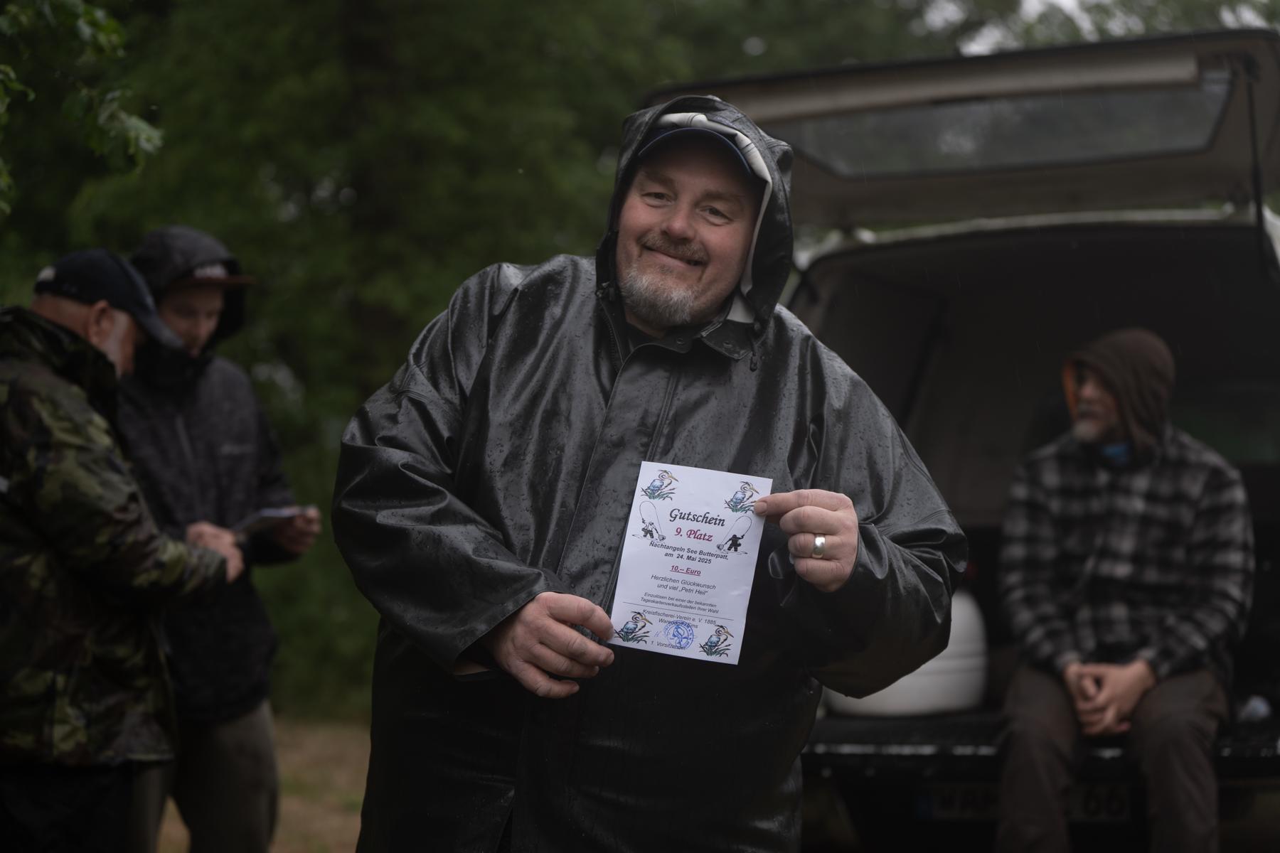 Zugute kam den Anglern der Umstand einer kurzen Regenpause zu Beginn des Fischens – gerade Zeit genug, um Zelte und Schirme in Stellung zu bringen. Doch kaum war der letzte Hering eingeschlagen, öffnete Petrus seine Pforten. Und wie! Innerhalb weniger Minuten verwandelte sich das Gelände in ein feuchtes Biotop. Was nicht rechtzeitig unter Dach gebracht worden war, wurde klatschnass – ebenso wie so mancher Angler, der in der Eile dem unbarmherzig niederprasselnden Dauerregen nicht entkommen war.