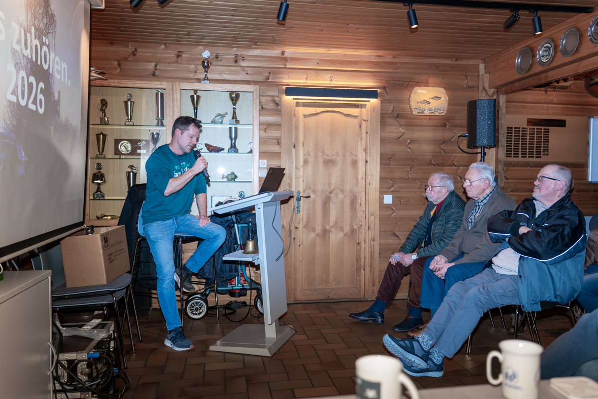 Gewässerwart Mathis Korn stellte in einer Präsentation die Arbeiten der Gewässerdienste vor und lobte die hervorragende Beteiligung sowie das große Engagement der Helfer. Gleichzeitig wies er darauf hin, dass die Beteiligung inzwischen teilweise das tatsächliche Arbeitsaufkommen übersteige, und stellte geplante Projekte für 2026 vor.